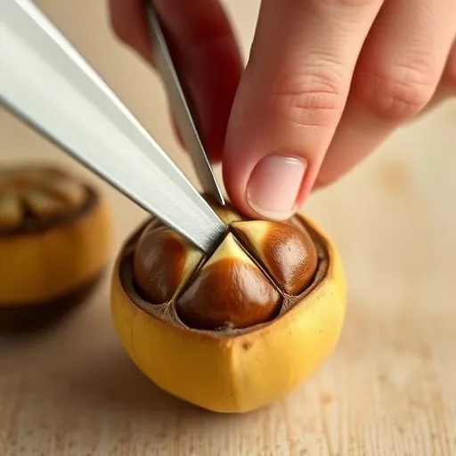 밤의 윗부분에 열십자 모양으로 칼집을 넣으면 껍질 제거가 훨씬 수월합니다.